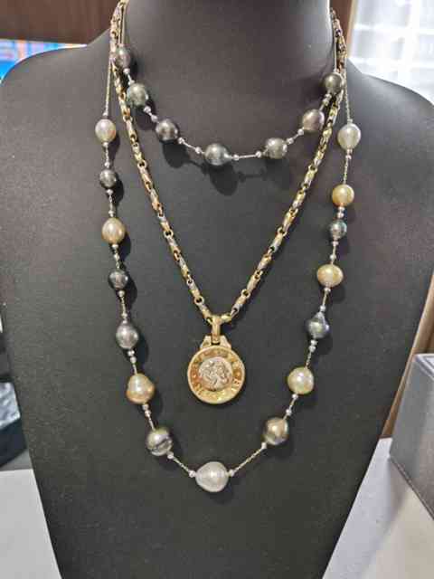 短いものは、シルバーのチェーンです。1本の南洋真珠の連ネックレスから、3本分くらいのステーションが出来ます。