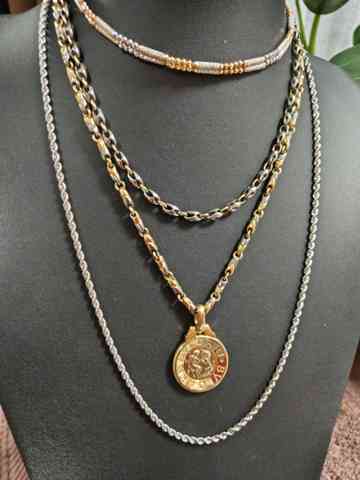 2,7mmは、私の中では最低線の細さのチェーンなのですが、この2本のブルガリチェーンも18kとステンレスのコンビだし、最近、1本はプラチナのネックレスが欲しいと思ってました。2,7mmを体感するため、1000円でステンレスのロープチェーン2.8mm 60㎝を購入し、「なるほど、これより、0.1mm細くて長さは同じか、、、」と重ねつけした際のボリュームなど、吟味し、これなら、いけると、購入しました。沼田さんは、これは、「ロープという形状にこだわったので、輝きという意味合いでは、少し抑えられてる」とおっしゃってましたが、思ったより、綺麗です。満足です、、、!!