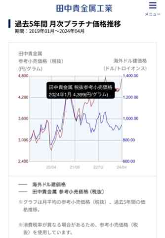 次に、㈱タコールの岩田氏が明言していたプラチナの買い付け時期 2024年1月のプラチナ相場 4,399円と、上記の倍率を用いて、単純販売価格を割り出します。
