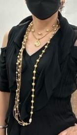 この写真のゴールデンロングは、1本でこの状態です。アシメトリーな、、、。私物は、チョーカーっぽくつけてるナチュラルゴールデンの5ピースのステーションとブルガリネックレスだけです。