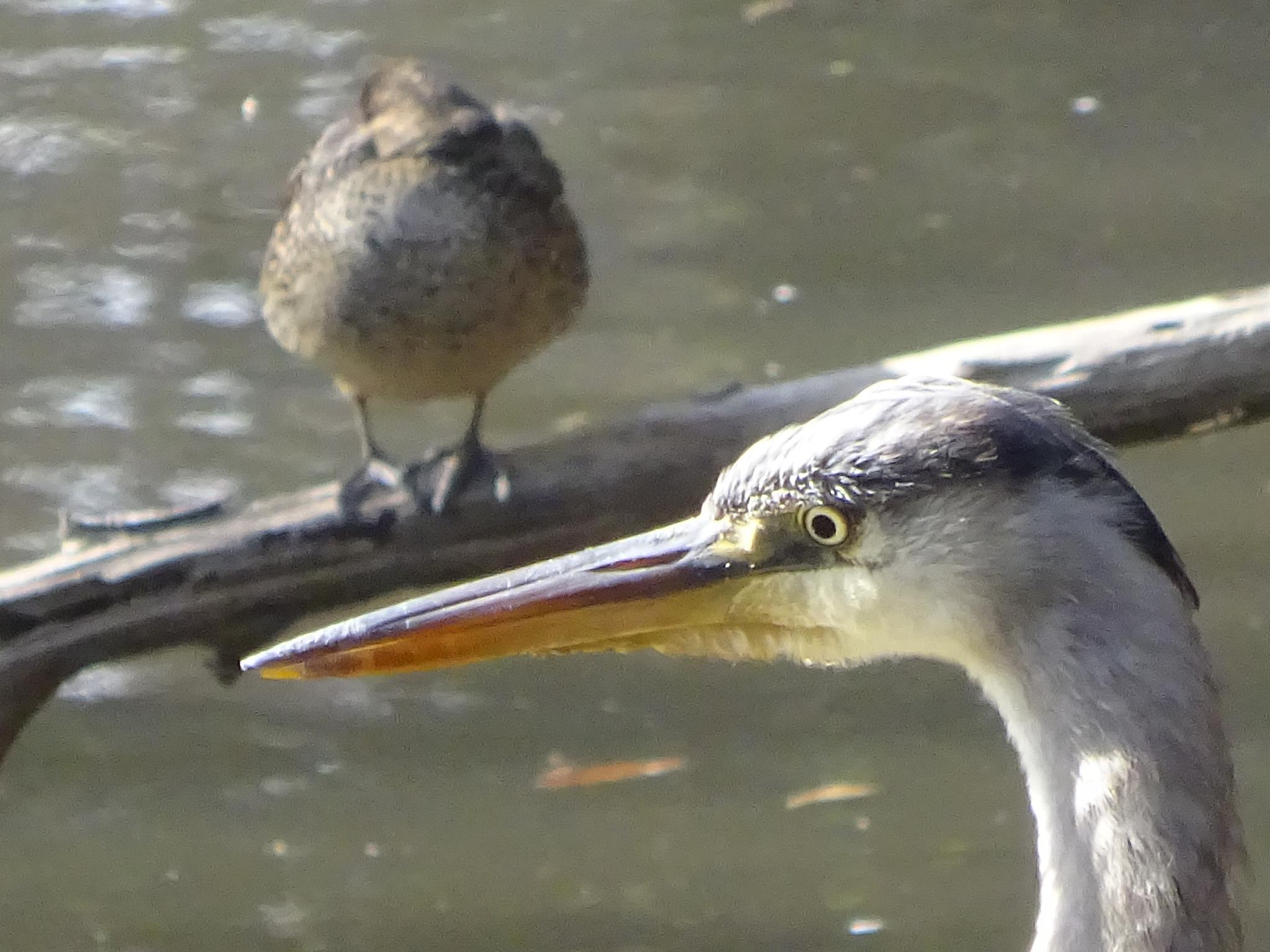 写真は青鷺の子どもと池の枝で昼寝の真鴨の雌(雄に比べて地味)。