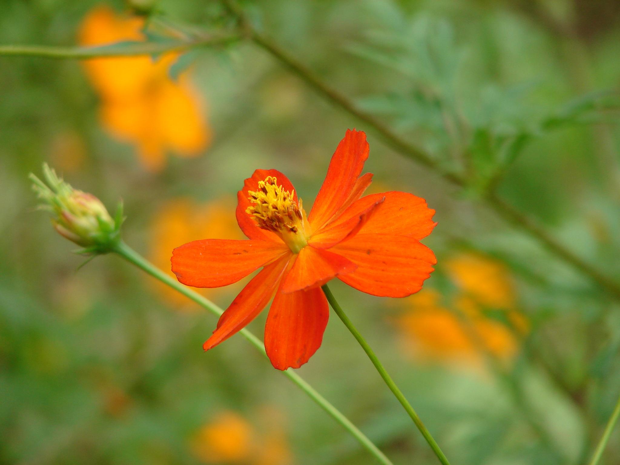 写真は「自由学園」の生徒たちが育てているお花畑に咲いていた黄花コスモス。黄花と云うが朱色が美しい。コスモスではこの花が一番好きかな。