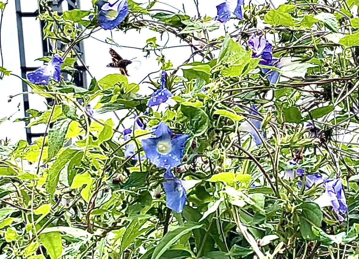 きっこさん、ハジメ2018さん、皆さんこんにちは。朝顔(昼顔かも)の蜜を盛んに吸っていたのはホウジャクという蛾ではないかと思います。写真の左上の方に見えています。