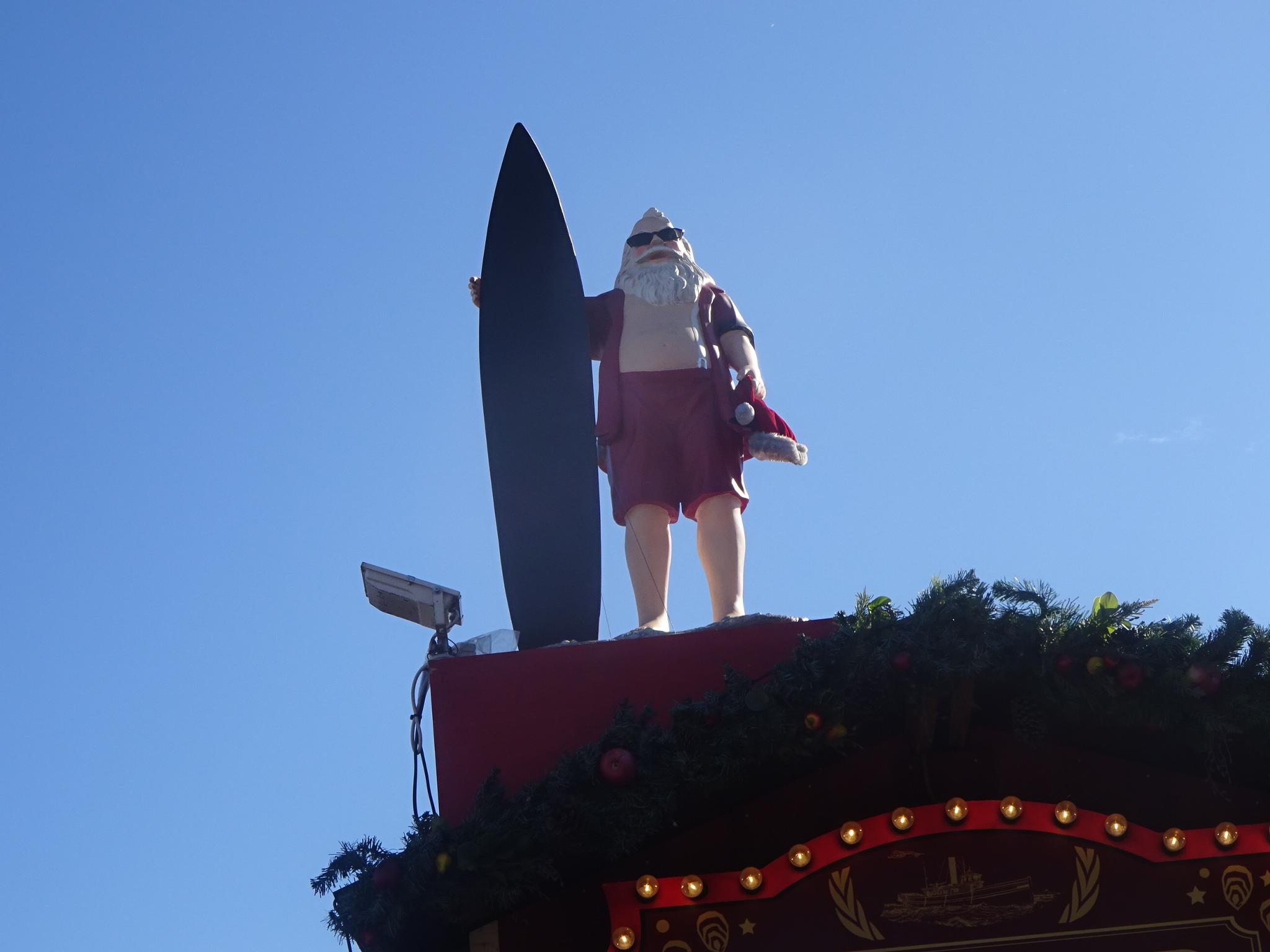 写真はサーフボードを持ったサンタさんでレイモンド・ブリッグズの傑作絵本『さむがりやのサンタ』のパロディですね。