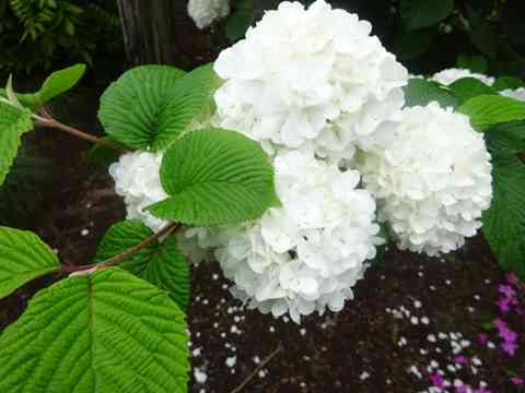 写真は白紫陽花がもう咲いたかと思ったら大手毬花。でっかいわあ。背景は躑躅です。