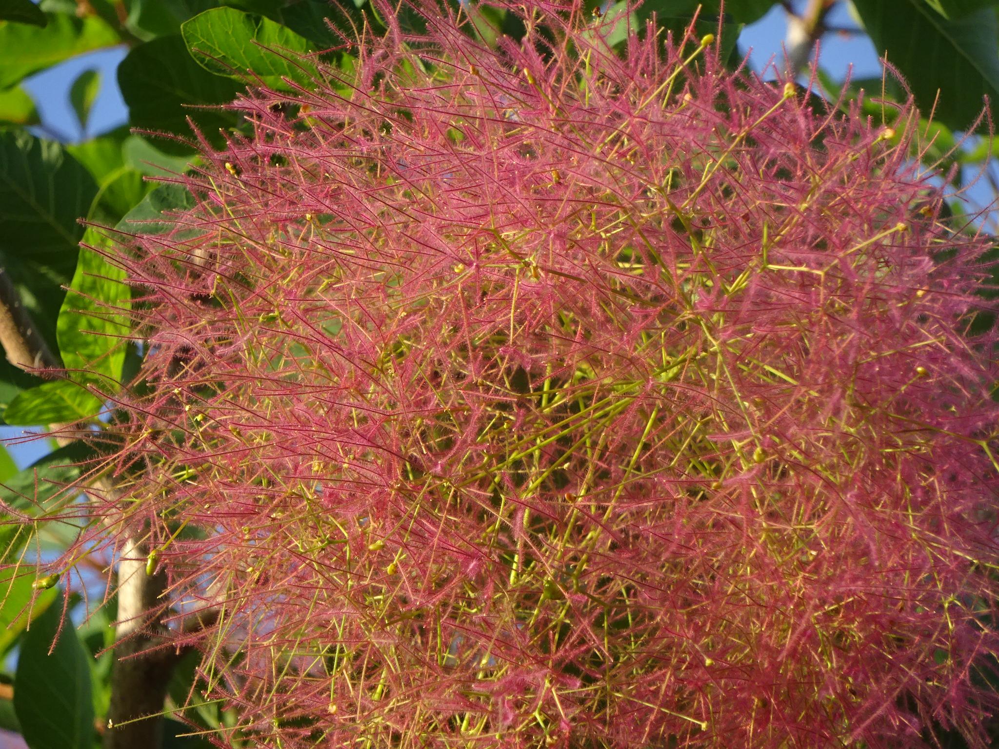 見た目が煙のようにもくもくふわふわした花を咲かせるように見えるので「Smoke tree」(和名は煙の木)と呼ばれ、ヨーロッパからヒマラヤ、中国にかけてが原産らしいが、日本には明治には輸入されていたというが、わたくしはロサンゼルスからサン・ディエゴに行く途中で見かけ、カリフォルニアからメキシコにかけてはカラフルで面白い花木があるなあと記憶にあったが、日本で見たのは横浜の植物園と杉並区の造園だけだが、園芸用にはピンクや茶色に色が変わるので人気があるそうな。五月中旬から煙の木らしく雌木の花の花柄が伸びて先にある種を遠くに飛ばすためにこういう形状になったようだ。