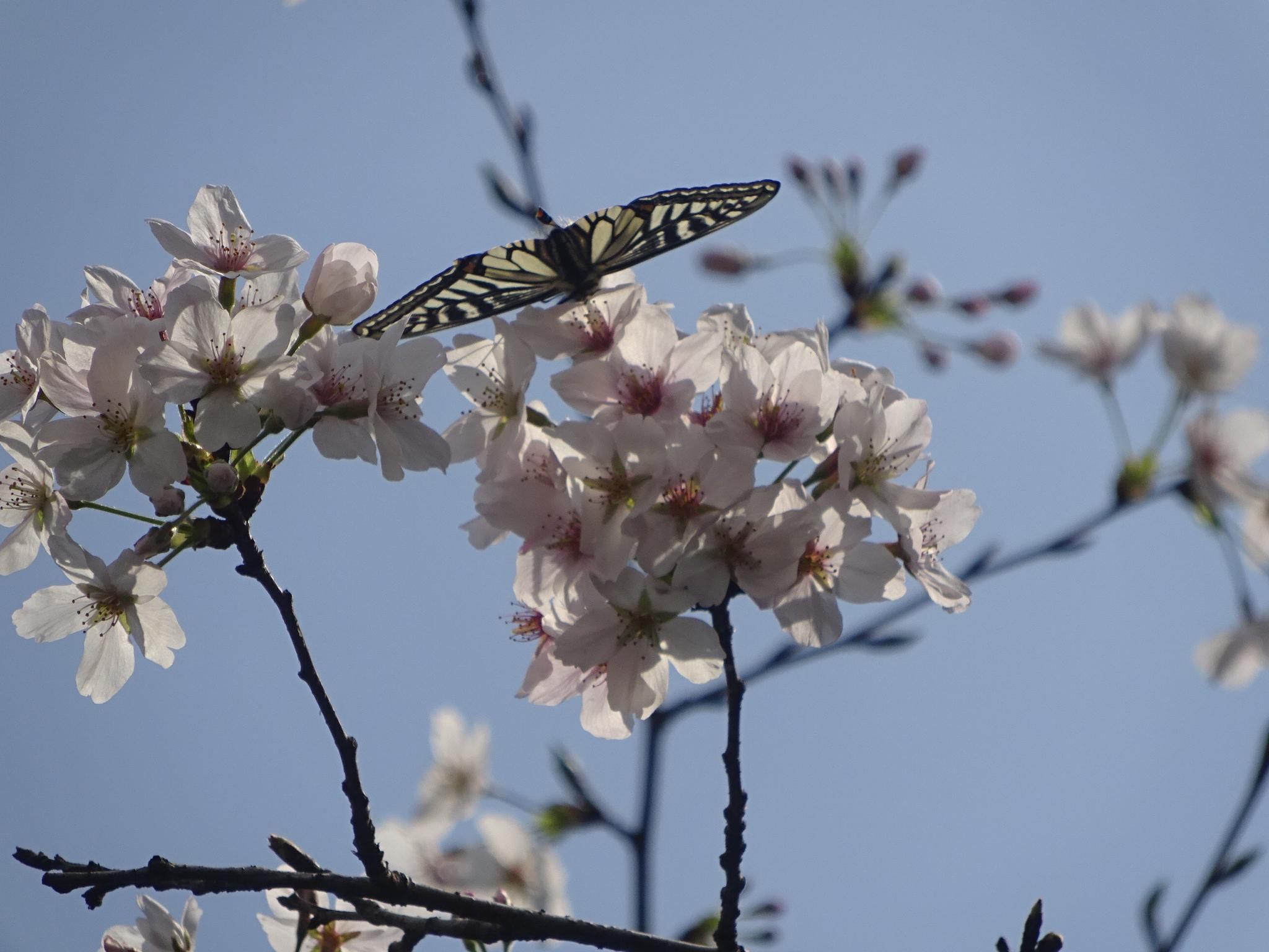 染井吉野は余り好きではないが、写真も撮らないのでは差別し過ぎかとカメラを向けたら揚羽蝶が蜜を吸いに来たのを偶然撮ってしまった。桜の蜜を食べに来るのは大ホウセイインコという馬鹿でかい声で鳴くインコと台湾リスぐらいだと思っていたら蝶が桜の蜜を吸うのは初めて見たので少しく驚いた。