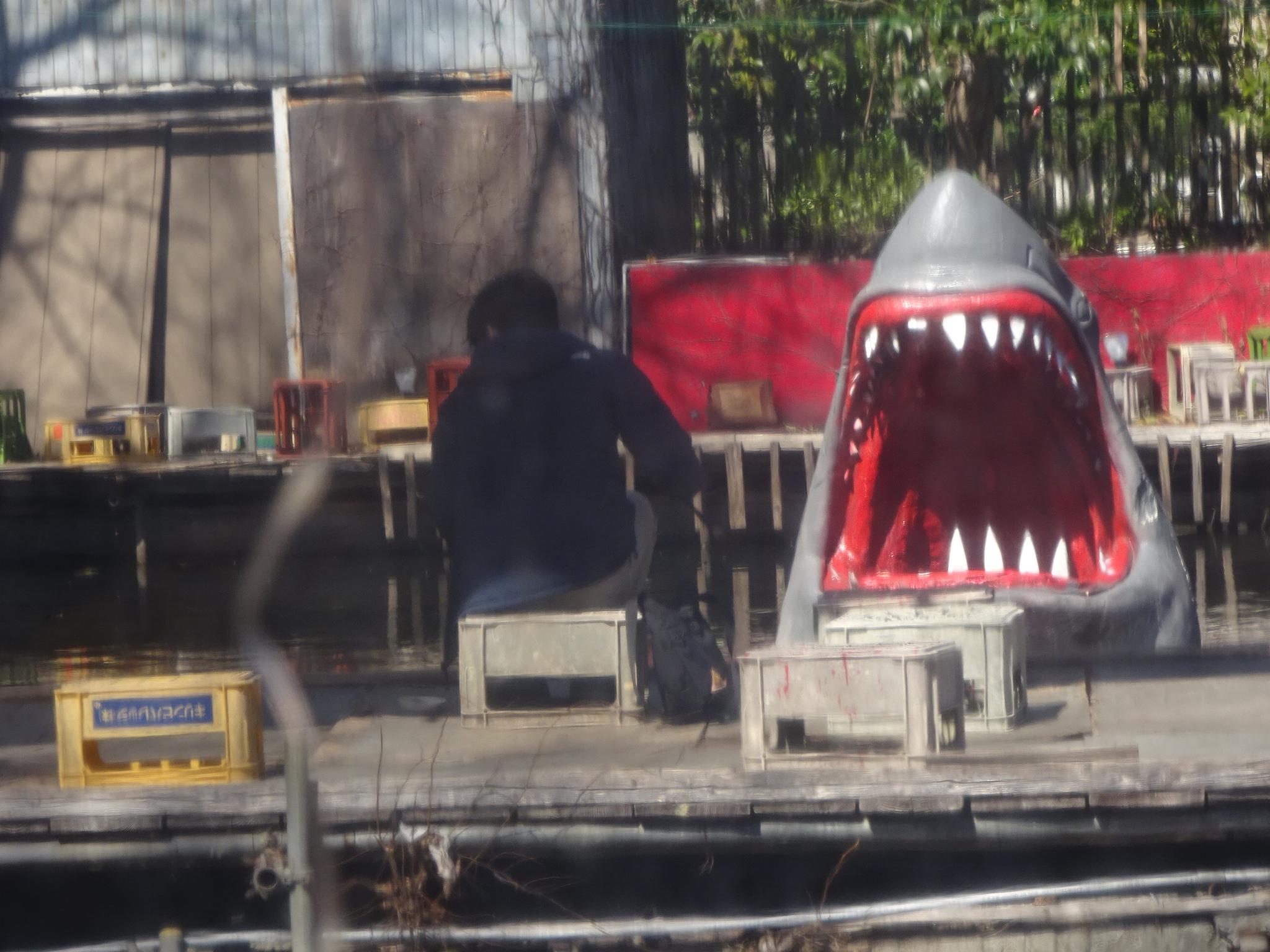 写真は近所の釣堀に置いてあるジョーズの張りぼて。TVドラマで使われスタッフが置いていったものだとか。これを見ながらチキン・オムライスを食っている。