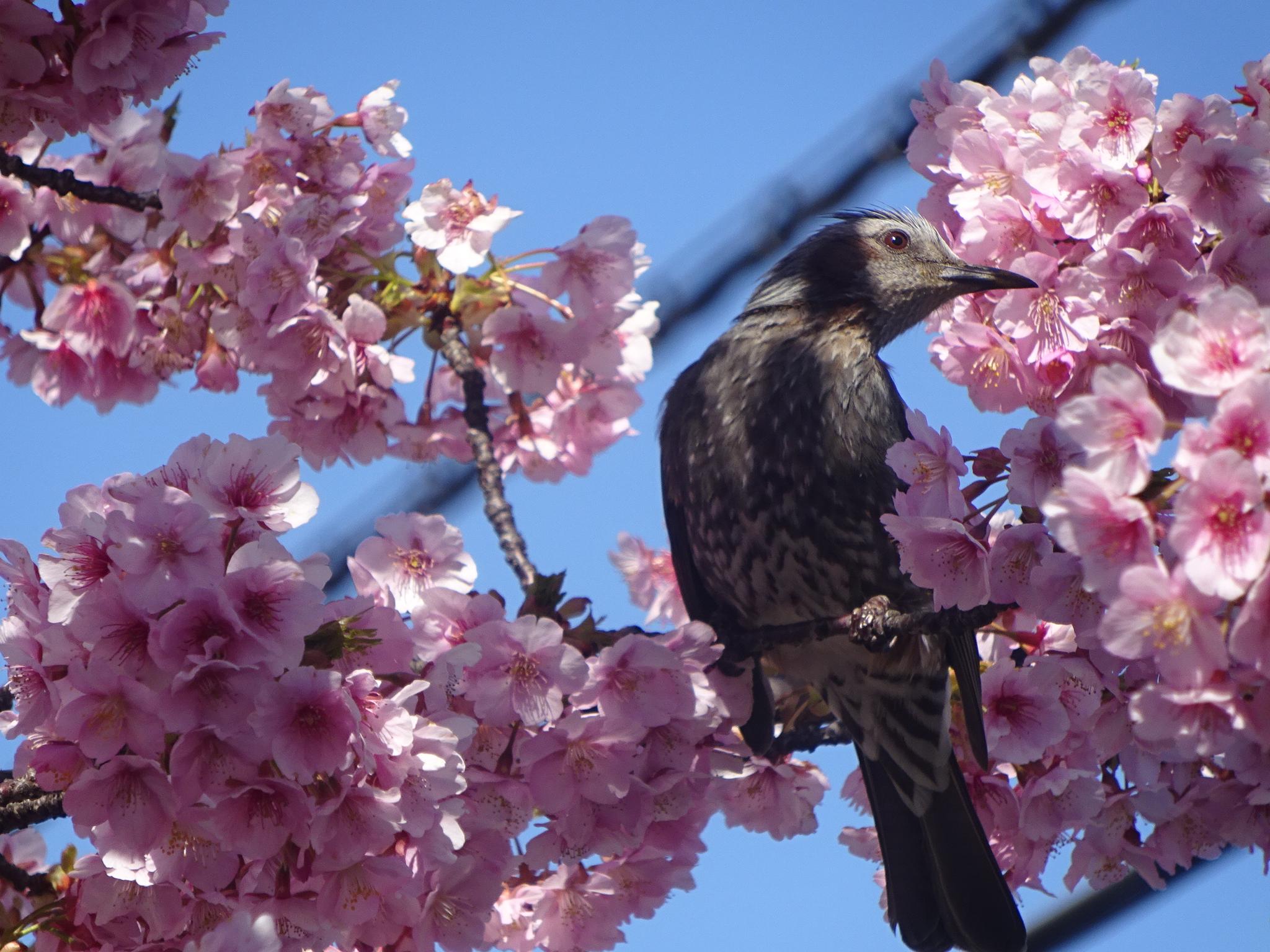 写真は河津桜の蜜を吸う鵯。