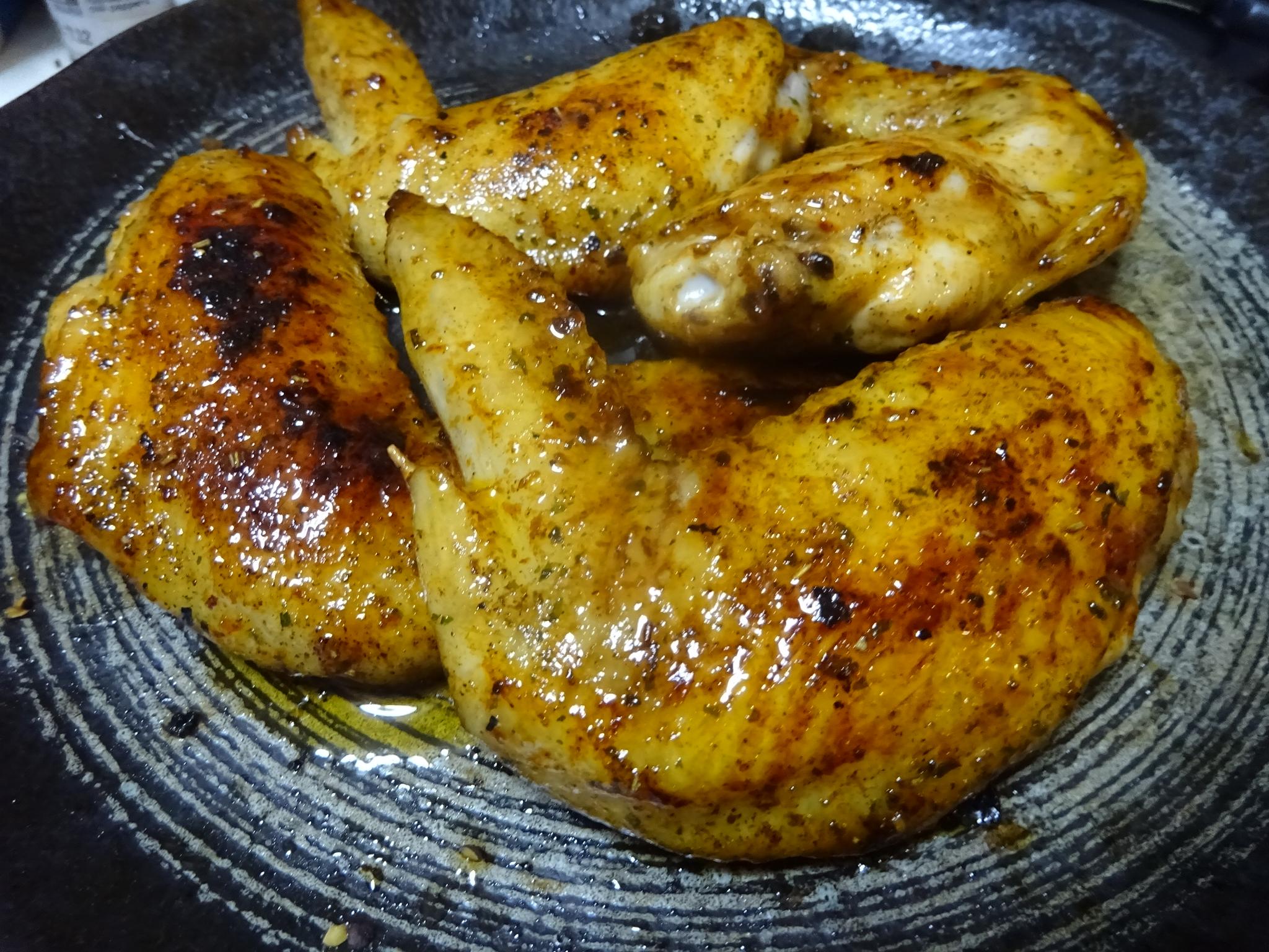 有田鶏の手羽先を塩胡椒して焼いて、それをオリーブオイルでホットソース(Frank’s RedHot® Original Cayenne ペッパーソースがベストだが他国のホットソースでも可で酢を垂らすとフランクスの味に近づく)を絡め、蜂蜜をとろ~り垂らして照りを出すと、「バッファロー・チキン」の完成。ウイングでもいいのだが、わたくしは手羽先好み。これがビールでもジンジャーエールでも合う。勿論御飯にも。(*^▽^*)ゞ。