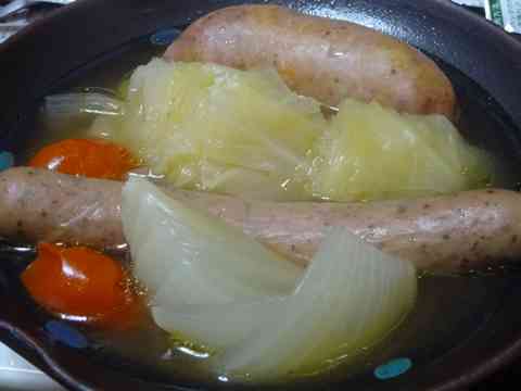 写真はフランス製のわたくしの一番のお気に入りのシブールフランクフルトソーセージと国産のレモンとパセリのソーセージとキャベツ、玉葱、ミニトマトを茹でただけのクリスマス鍋。本当はセロリとジャガイモと人参とマッシュルームを入れるが、これだけで十分美味しい。マギーブイヨン一個とオリーブオイルを垂らして塩少々で味付け。