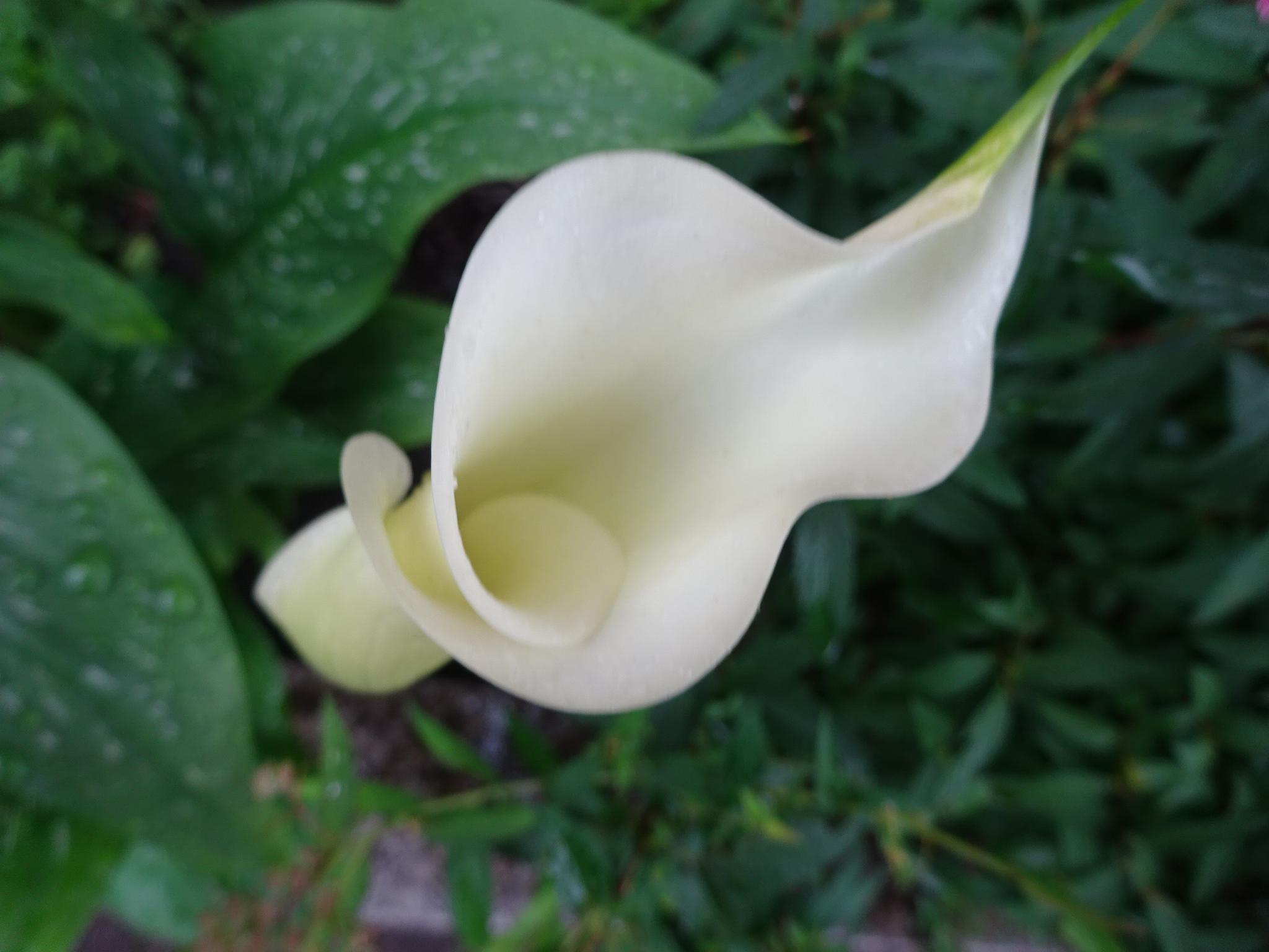 以前蝶の交尾を目撃したが、今朝はかたつむりの交尾を目撃した。と言っても蝸牛は雌雄同体で精子と卵子を持っているので精子を交換し合うことで産卵し合うので三時間はかかるから(かたつむりは恋の矢と書いてレンシと訓む槍をツンツン出して恋心を訴えて精子の交換を催促するとか)、中野区まで自転車で40分はかかるので仕事で急いでいたし、どうも求愛中らしく、白髪を引かれながらも駐輪場に向かったが、帰宅してもまだ睦んでいるかとも思ったが、さすがに五時間も経っているのでもうお二方ともおらず、いつも行き合う園丁の娘の伯母さんと桃色海芋の盗人の話をしていたら、図書館の掃除婦さんも出て来て、もう一人の掃除婦さんが花が好きで彼女がカラーや半夏生を植えたらしいが、伯母さんの話だと、この花盗人は剪定鋏を忘れて行ったことがあり、どうも図書館の花を盗んで我が家に飾るのは泥棒ではなく本を借りるような当たり前の行為だと思っている図々しい住民らしい。鋏を忘れてゆくほどの間抜けぶりはそういう印象を与えるねえ。白海芋は沢山花を出しているが、桃色海芋は一輪だけだったので殺生なことをするねえと嘆き合った。写真は盗まれる前日の桃色海芋である。