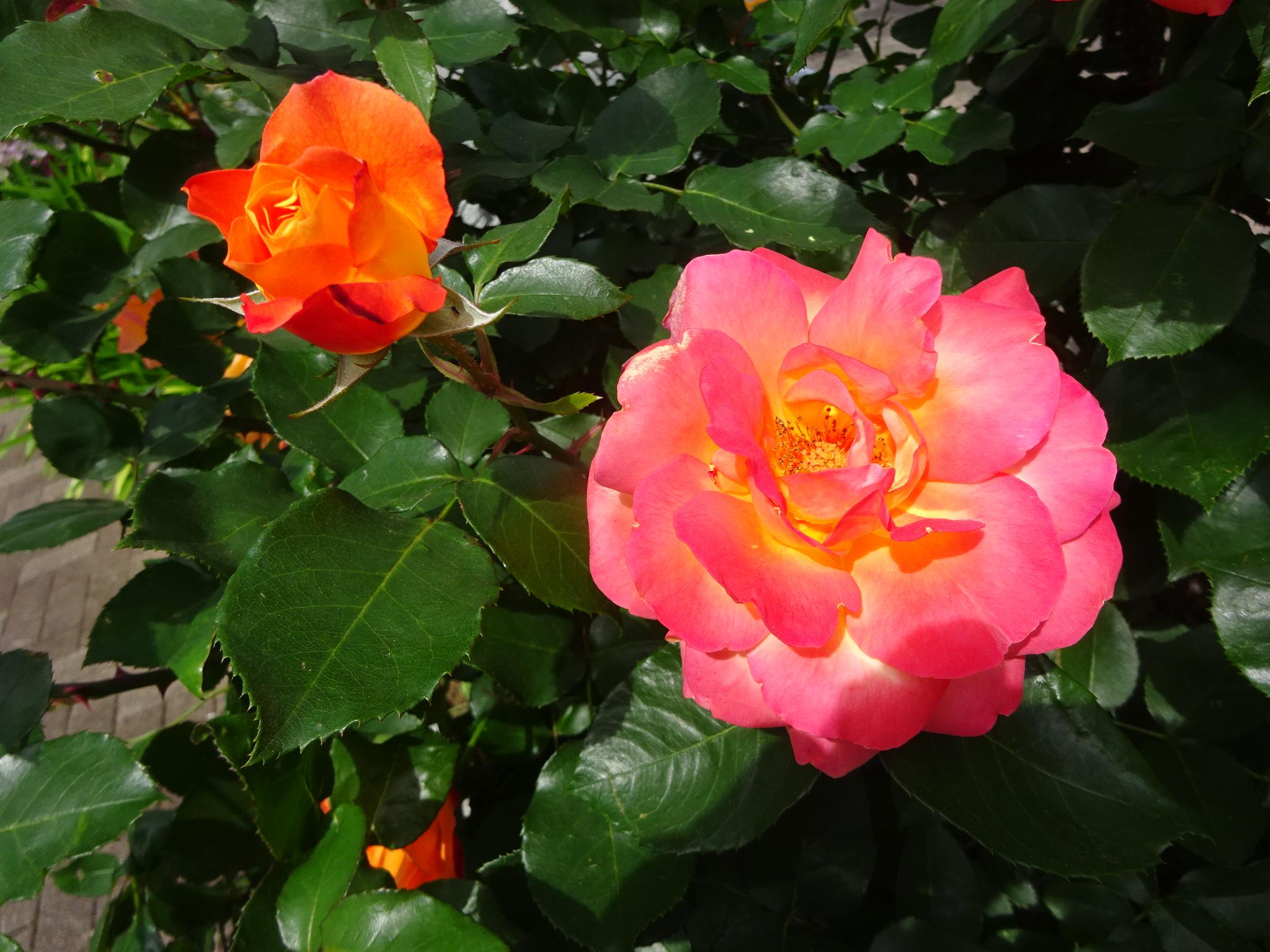 背景の花は下井草図書館の庭に咲き乱れている美しいオレンジのピンクや赤を散りばめながら咲く薔薇で「Souvenir d’Anne Frank(アンネ・フランクの思い出」という名前で呼ばれることを今年初めて知った。作出者はベルギーのヒッポリテ・デルフォルヘがアンネの日記に感銘を受けてアンネの父オットーに捧げられたとのことで、大きさは8センチと大振りである。「アンネの薔薇」と呼ばれる薔薇があることは聞き及んでいたが、まさかアパートから歩いて数分の図書館に咲き誇る美しい五月の薔薇がそうだったとは。