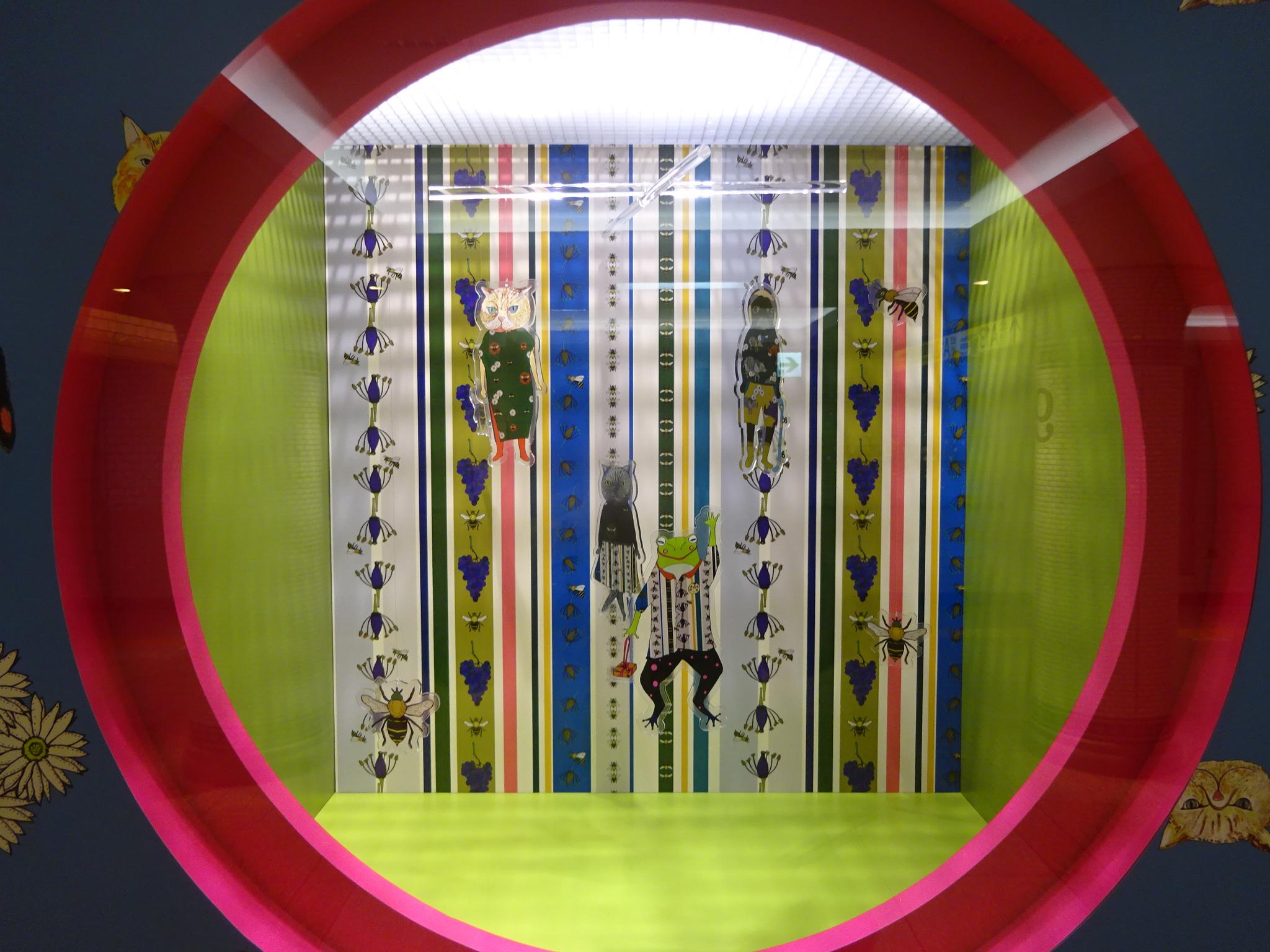 写真は銀座の松屋へ向かう地下鉄のショーウィンドウ。猫や蛙がぶら下がっている。