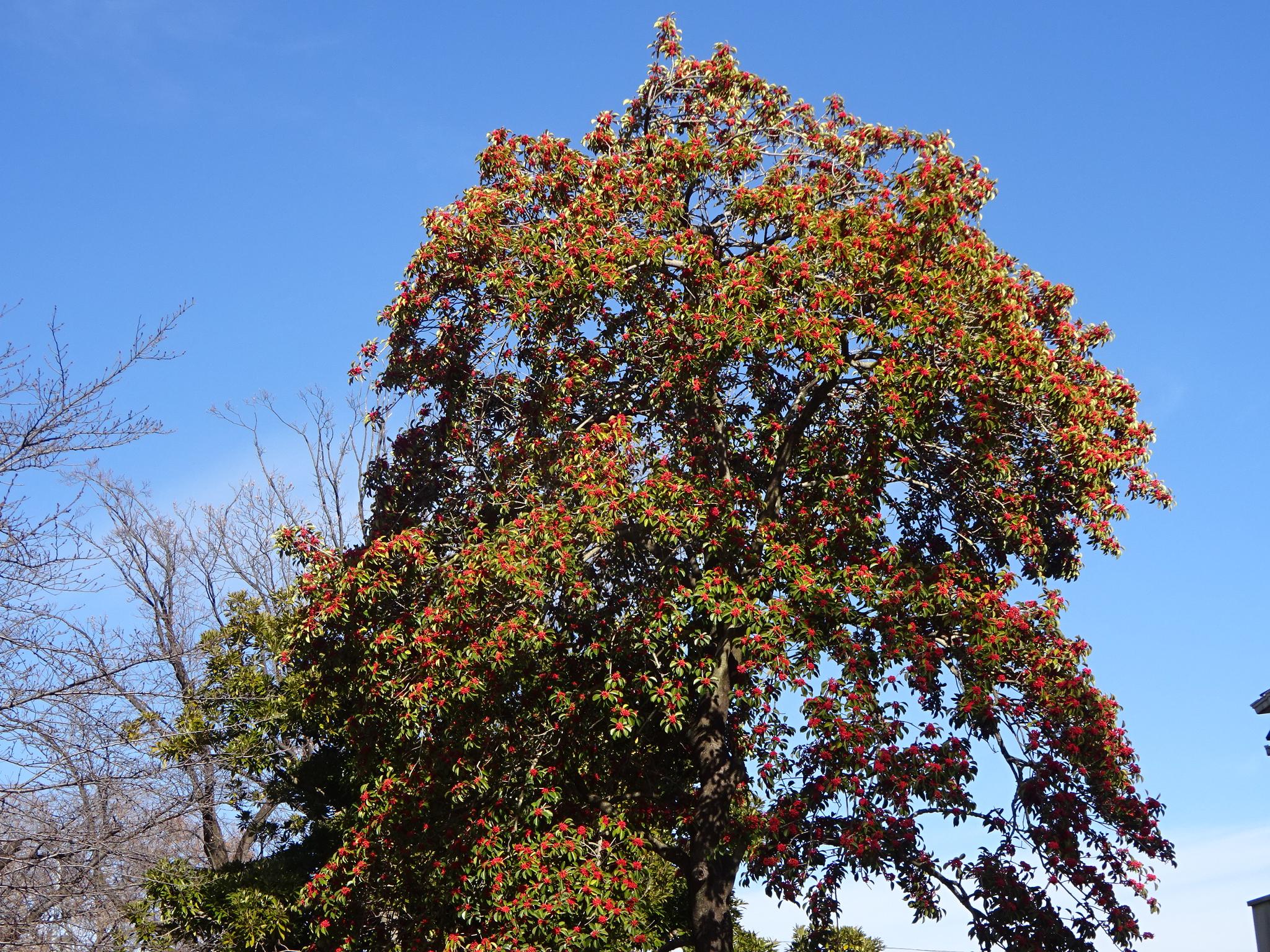 写真は黒鉄黐(くろがねもち)の雌株の木でびっくりするぐらい赤い実がたわわに実っていた。花水木の赤い実はまだ食べごろではないのか残っていたが、こちらは食べごろらしく四十雀はじめ小鳥が群がって啄ばんでいた。