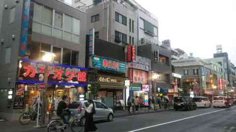 写真は大久保駅表通り。夜になると露地裏はラブホテルや連れ込み旅館の灯が点る。ホームから見える大きな性病科産婦人科の看板も。
