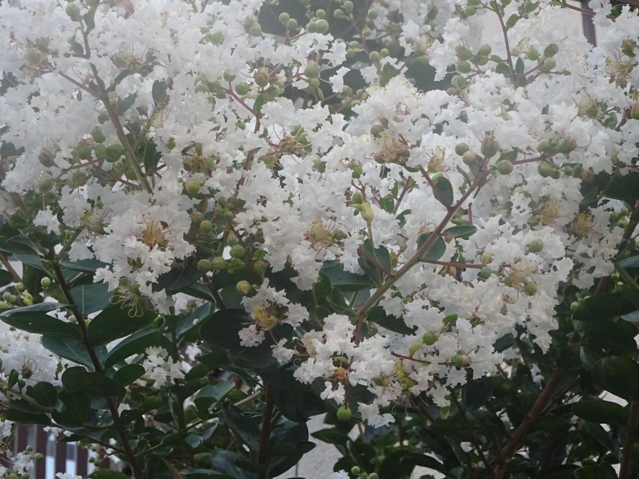 写真は白い百日紅。黄花コスモスも先週から咲き始めたので秋の気配も感じられるが、36℃を越える暑さで30℃が涼しく感じる暑さではある。
