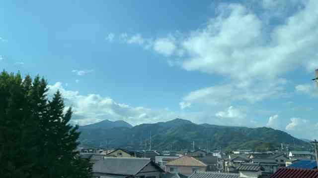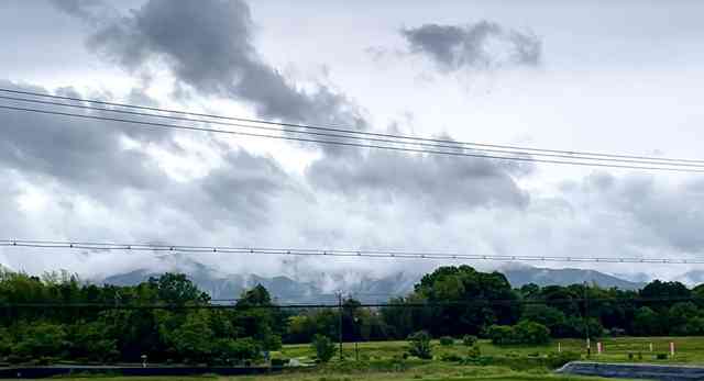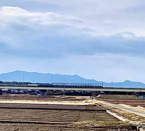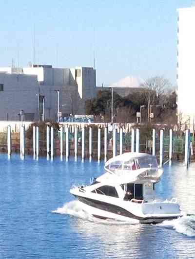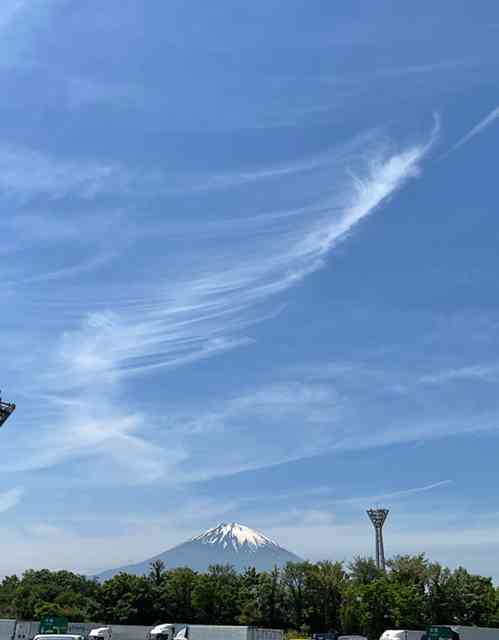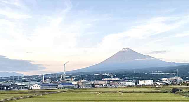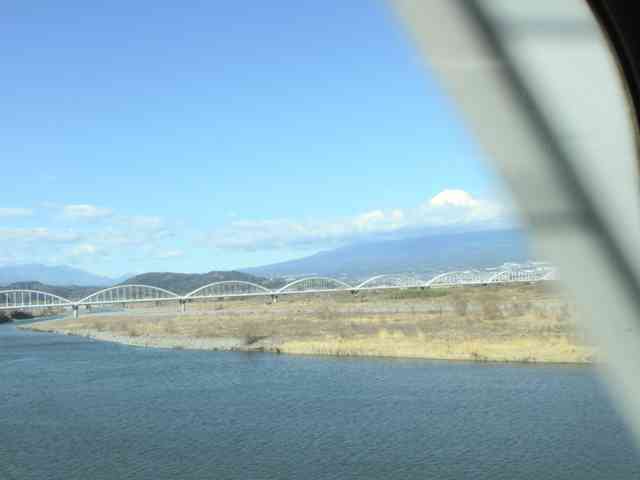 一瞬の富士の冠雪窓外に