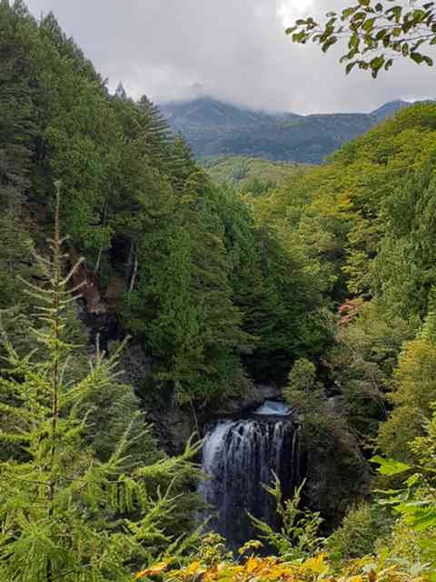 やせてもかれても3000m峰である。紅葉が山全体を覆い、はえまつの緑と混ざり、パッチワークのように見事であった。九月下旬が最盛期らしいがまだまだこれからも見どころである。観光化がすすみ、日本で一番手軽に3000m峰に登れるこの100名山は、なんと紅葉期も絶景であった。スキーの季節に登山で登頂したことはあったが、景色は別物である。頂上の小屋や奥社は今日は開いていた。登山客も多く、予約なしではバスに乗れない。曲がりくねりの山道を50分、標高2500mまで登る。日本一高い標高のバス停であるらしい。下の街の民宿に泊まったが、何処も温泉は素晴らしい。泊まったK松荘はコスパも素晴らしく、9000円の宿代で一泊2食付きの料理が堪能できる上にカンビールが280円となんとも良心的な価格。高騰の波にのまれている山岳地域の多い中、ここも北アルプスの南である。追加で前日散策した3つの滝がなかなか傑物、一見の価値ある滝と書き加えておきたい。