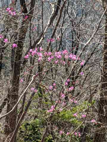 感動は中登坂~落合の下り坂で出会いました。なんと早くもアカヤシオが三部咲で開いていました。3本ほどでつぼみだけの木もありました。この時期に思わぬ自然の送りものに一同、崖っぷちギリギリで接写。一気にテンションもあがり、計画通りの山行完登を可能にしました。帰宅後、花の詳しい仲間に写真転送したら、ミツバツツジではとのこともあり、ちょっと半信半疑ではありますが、絶対アカヤシオとの思いが強いです。誰か確認してください。