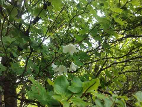 天気予報は曇りのち晴れ。現地は小雨交じりで山々は一面のガスでおおわれていました。眞名井北稜ルートは緑濃い木々で覆われ、雨粒を蓄えた木立は、湿度もたかく、帽子を一杯に濡らすルートになっていました。期待したシロヤシオの花は、稜線の高度を上げても見ることはできず、士気は今一上がらず、急登を喘ぎながらの山行となった。それでもバリエーション好きの面々は、頂上を目指して、岩稜帯を抜けると一般道へと飛び出た。もう後は、最後の頂上への登りだけというところで、一枝のシロヤシオの花を見つけ、一気にテンションが上がる。「これを観たくて登ってきた。」 期待した群生には程遠かったが、またの機会もあろうというもの。