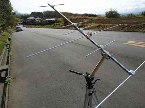 ブーム長90cmのマルチバンド6エレ小八木です。一応、MMANAでシュミレートして挑戦しましたが、430MHzが上手く行かず。ここで先日入手したNanoVNAの出番です。給電前の430MHzディレクターの位置を少し離すと最良点が見つかりました。材料は、JO2ASQさんの記事を参考に、ブームは1辺10mmの「コの字型筋入チャンネル」と呼ばれるアルミ材。エレメントは外径6mmのアルミパイプ。エレメントの固定は、100均のワイヤーネット固定フック(4個入り)。これは、内径が5mm程だったので、ドリルで少し削りバッチリ固定できています。144MHz、430MHz共にSWRは1.2程度に納まっており、数値上は使えそう。次回実践してみます。