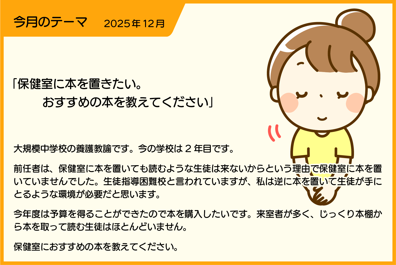 今回の相談主旨は「おすすめの本を教えて」というもので、保健室に本を置くということを前提にしていますよね。私は保健室に本を置くことには反対です。保健室はあくまでも救急用に備えられている部屋であると思うからです。