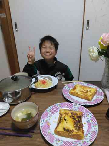 今朝は、昨夜の残り🍚をチャーハンにしてパンは、フレンチトーストにしました(^_^)