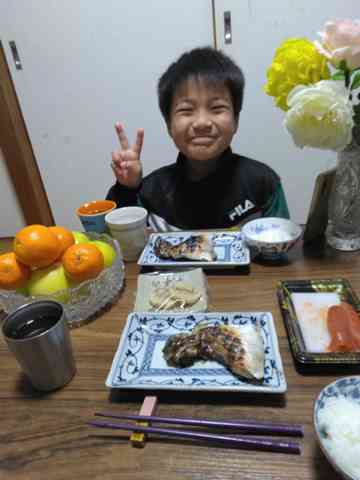 夕飯は、ブリのカマと兜の塩焼きだって(^_^)