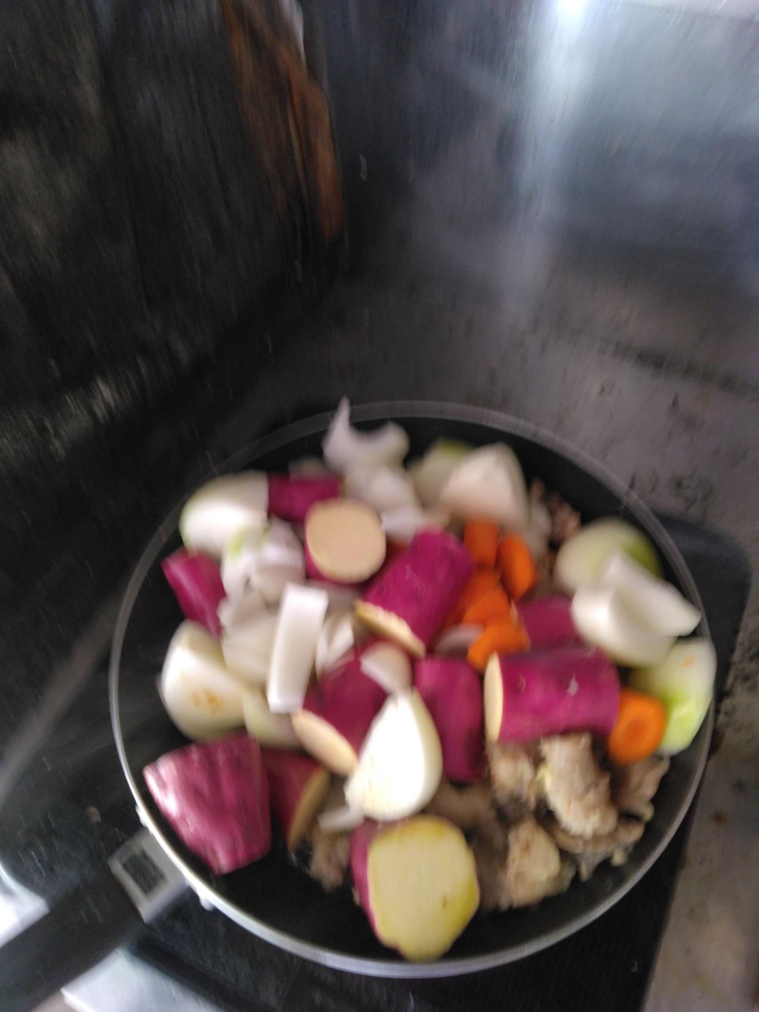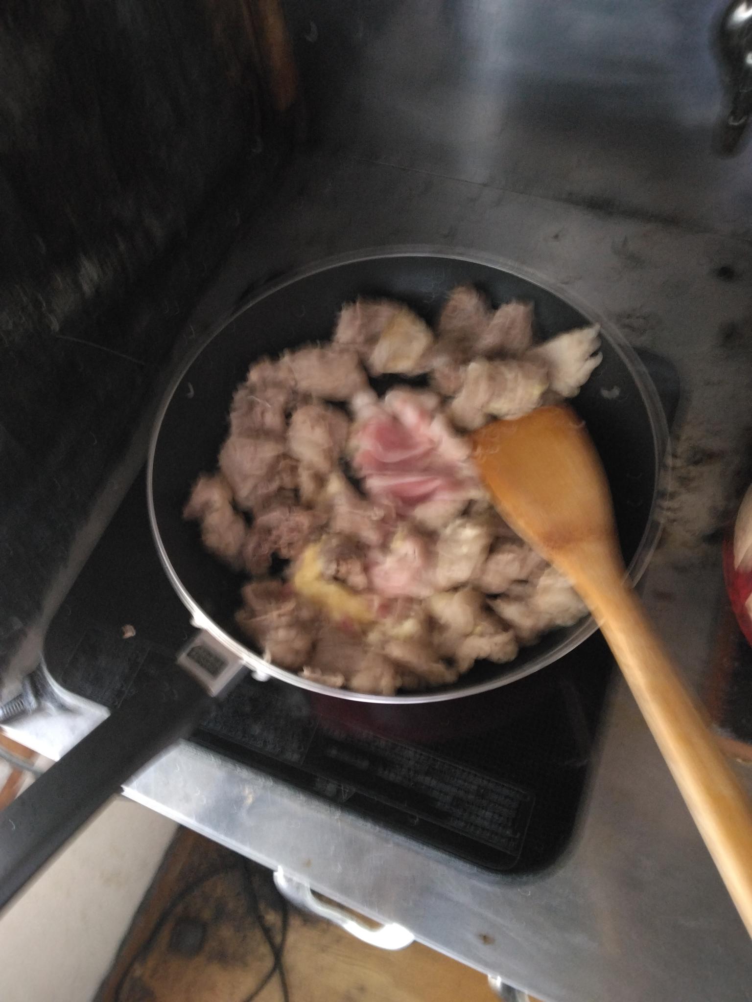ボイルしたすじ肉とバラ肉をしょうがとニンニクで炒めます(^_^)