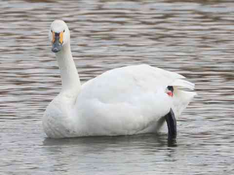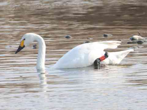 コハクチョウの左脚【ふせき】に足環カラーリング[色赤、刻印33]付が滞在しました。