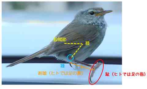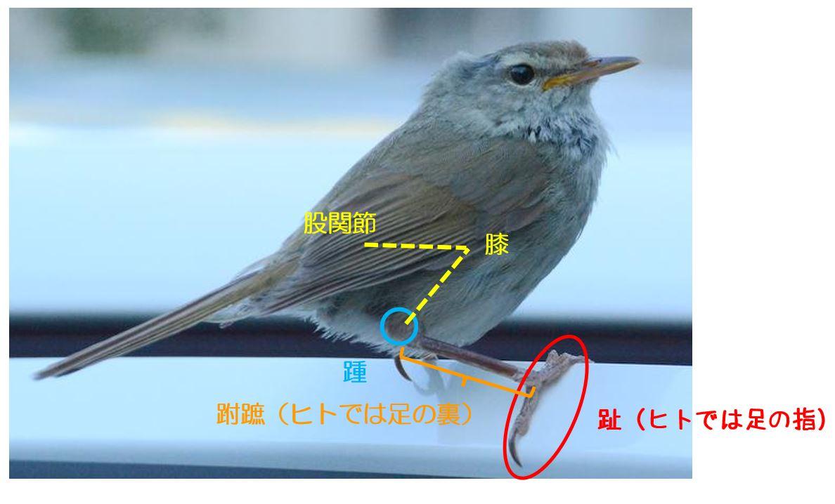 ここでいう「足」とは「趾(あしゆび)」ではなく、主に「跗蹠(ふしょ)」をイメージしていました。わかりにくいので、勝手ながら、いちじんさんの画像に書き足しました。この個体の跗蹠は黒っぽいように思います。ついでに書くと、跗蹠が淡い色の時は口角と同じように少し肉質で跗蹠も太いように感じますが、黒っぽくなると引き締まった感じになります。老婆心(老爺心?)ながら、足の色の変化は種によって異なります。雛が鈍い色で成鳥が淡い色の鳥もいますので、誤解されませんように。