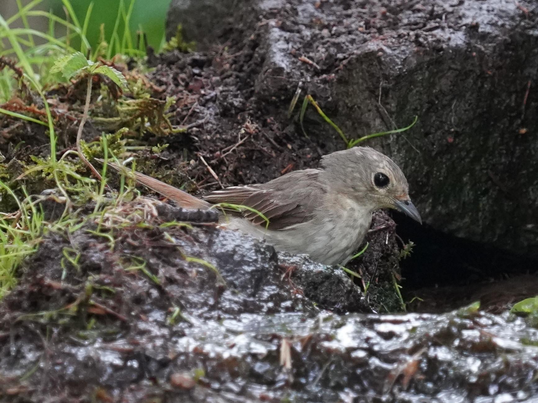 となるとキビタキやルリビタキ等ヒタキの幼鳥はグレーに見えるので、これはオオルリの幼鳥ではないかと思いました。でも♂なら多少青色の羽が混じっていても良いのではと考え♀の幼鳥としました。確かにヨタカさんのおっしゃるとおりに今年生まれた幼鳥なら黄色い嘴のヒダがあって普通ですがこれにはありませんからそれはなしですね。ということで昨年生まれのオオルリ雌の幼鳥・・納得してしまいました。暗い森の中で撮影条件が悪くブレやすいので鮮明な画像もありませんし後ろ姿でもあれば良かったのですが、それも撮影できませんでした。足は見えませんが横の姿が1枚だけあったので追加しますが、尾羽は確かに茶色っぽいですね。