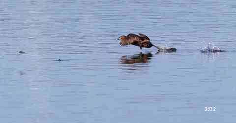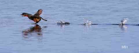 九十九川と碓氷川の合流地点で板鼻堰の広い川面では、通常ではちらほらですが稀に環境条件が整うと広範囲に多くの川魚が意を合したかのように、一時「約30分間ほど」一斉に川面上に跳ね上がることがあるようです。時は7月下旬日の7時前、川魚が広範囲に密な状態で多くの川魚が川面上に跳ね上がる初めての光景に遭遇。最初は5分間程見とれてましたが左岸を見るとカイツブリが川辺の草むらを出入りしてるのを確認し胸中が騒ぐ。急遽して機材を三脚でセットアップし、レンズを左岸縁に向けて間もなく:いきなり:カイツブリが川面中央に向かい水面を高速で走り出し何とか途中からでもレンズを追随、ワンタッチ3枚連写での投稿画像です。それにしてもカイツブリさん通常は水中での名ハンターなのに、水面上でも狙った獲物は逃さない俊敏な業に感服しました。