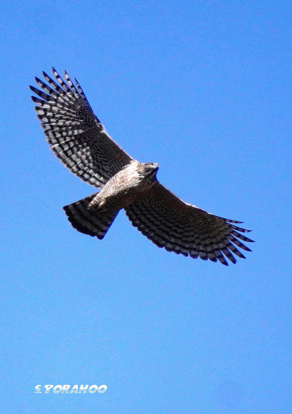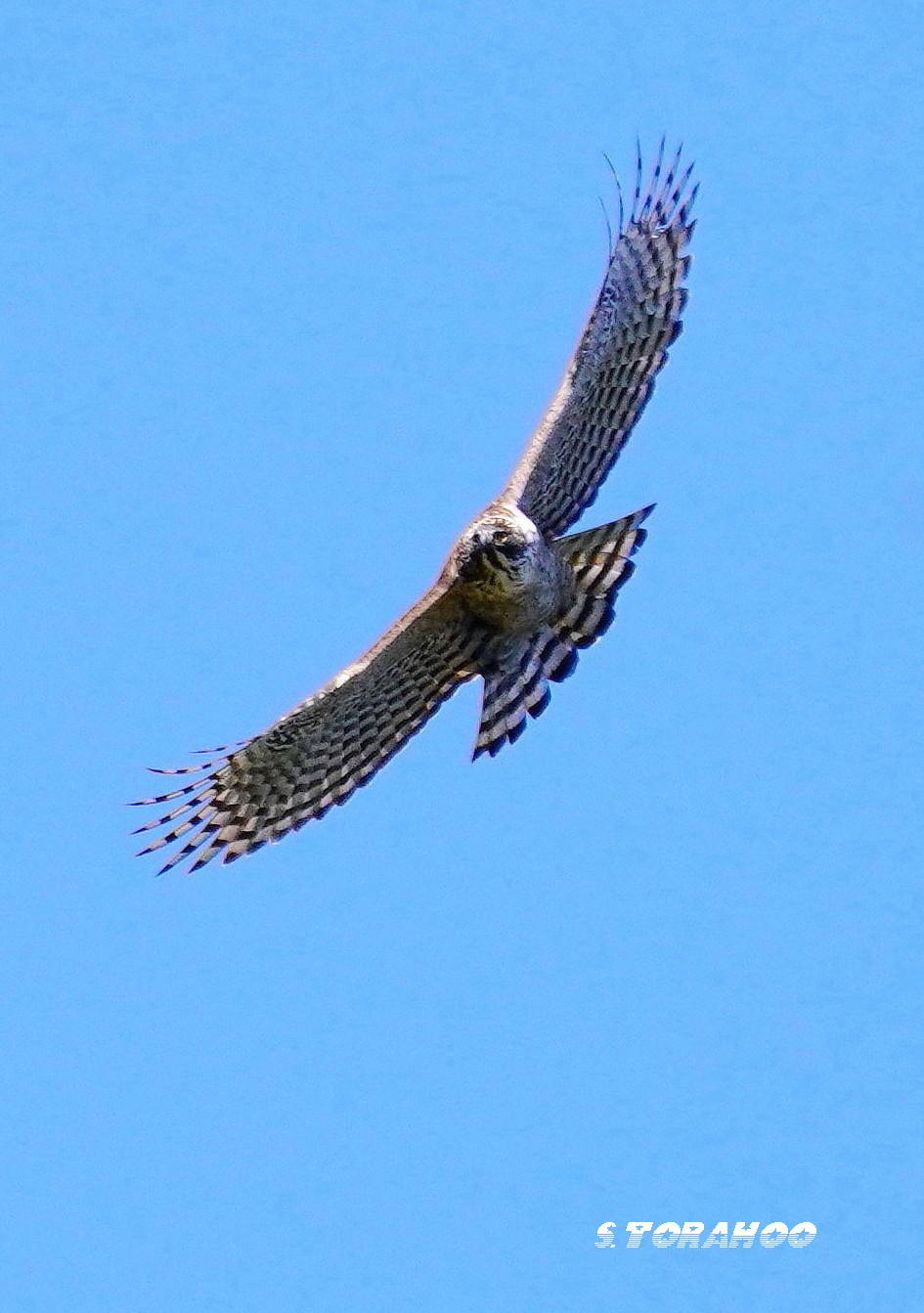 風もない穏やかな今朝、少しだけ開けた山懐に入り込み鉄塔にパーチしているクマタカを見つけました。急いで滑らかに動く重量三脚をセットし終わった直後、同時に飛び出したクマタカを追いかけました。何と餌捕り狩場の上空を9回も旋回し又、同じ鉄塔にパーチするまでの約2分弱の飛翔です。空抜けですが、だからこそクマタカ本来の雄大な飛翔に元気を拝受しました。