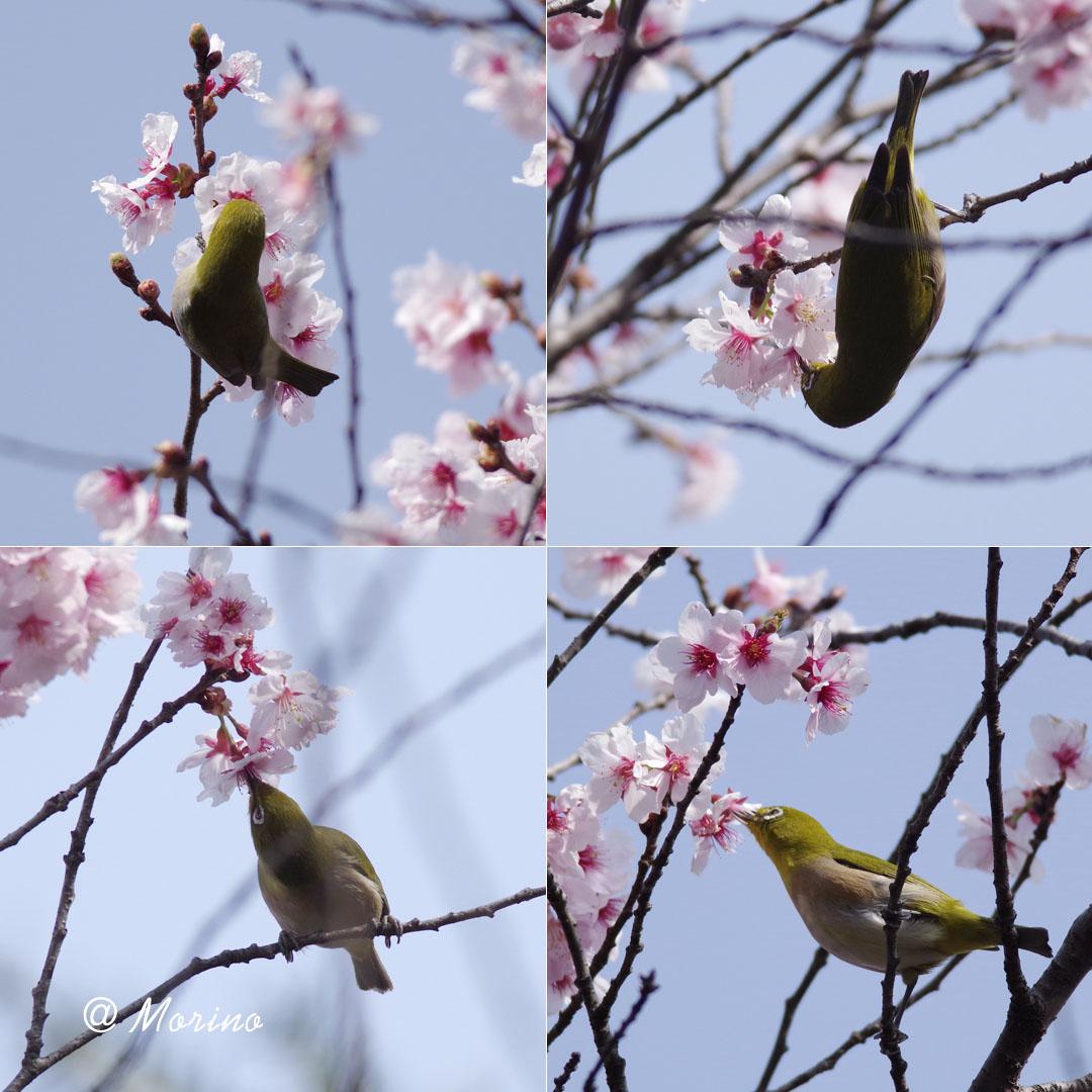 かんざくらが開花、早速メジロの小群が飛来し忙しく吸蜜