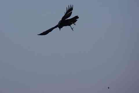 【写真1】クルミをくわえて飛び立ったハシボソガラス
