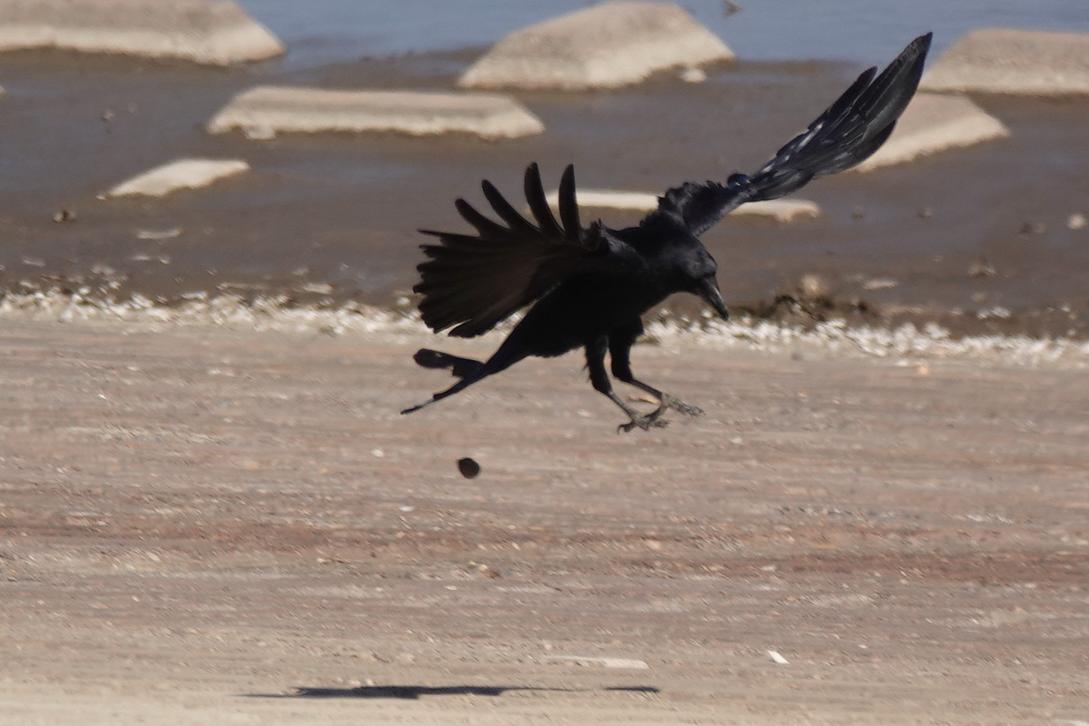 【写真4】コンクリートブロックで跳ねたクルミの近くに降りるハシボソガラス