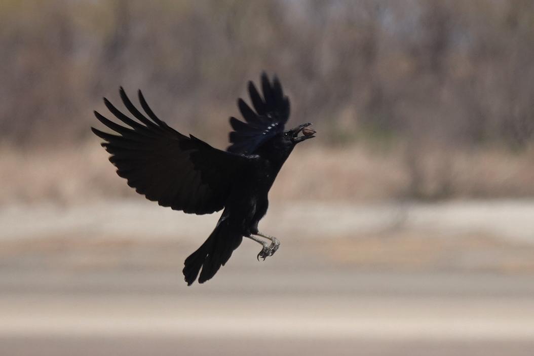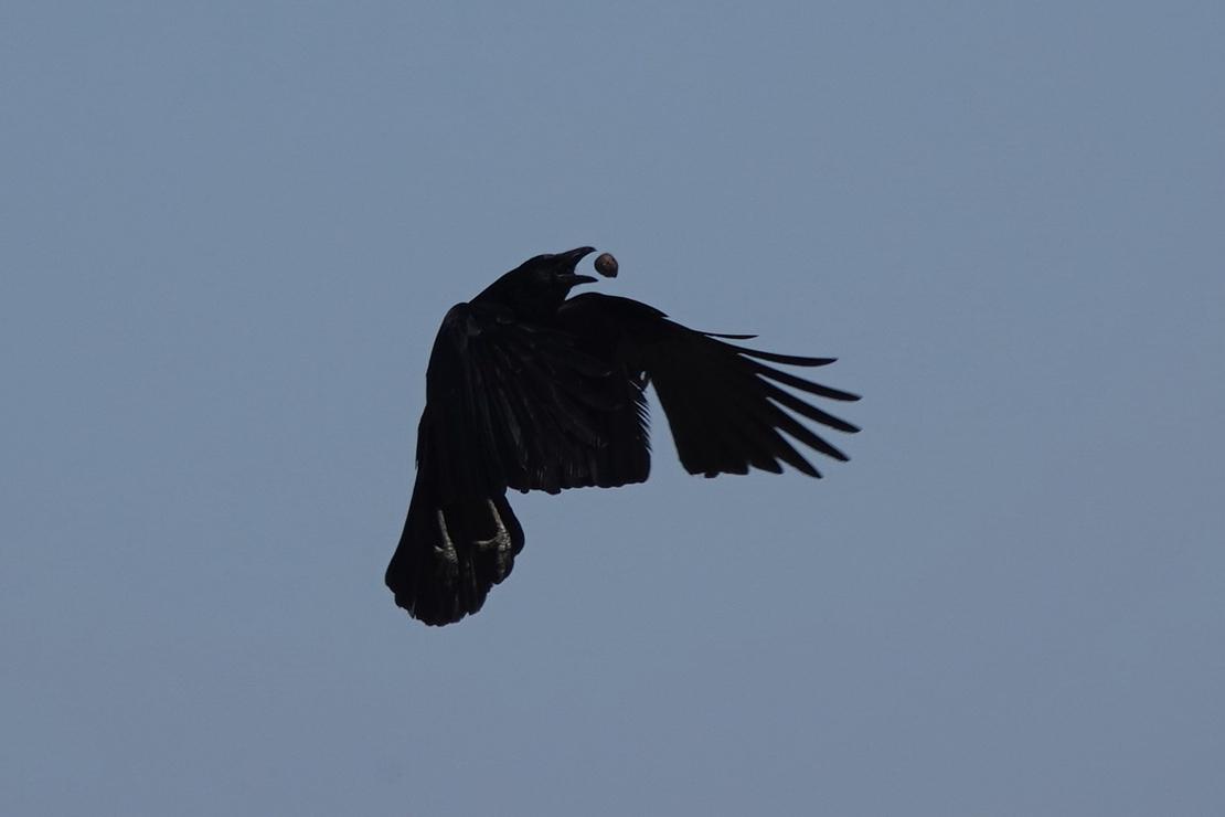 【写真1】クルミをくわえて飛び立ったハシボソガラス