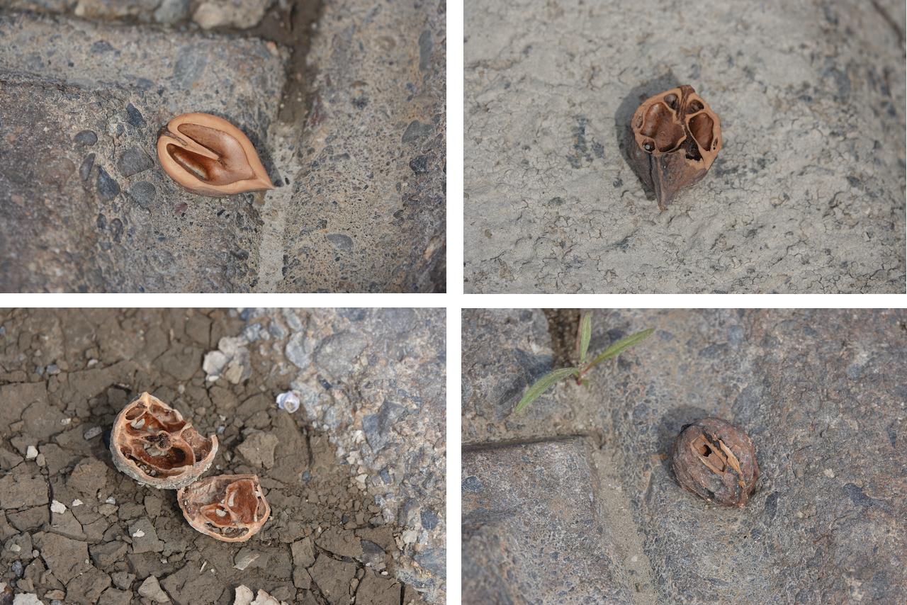 この前クルミを落として食べていたところに行って、クルミの殻を探しました。