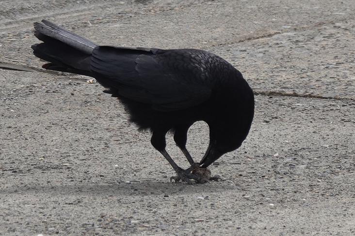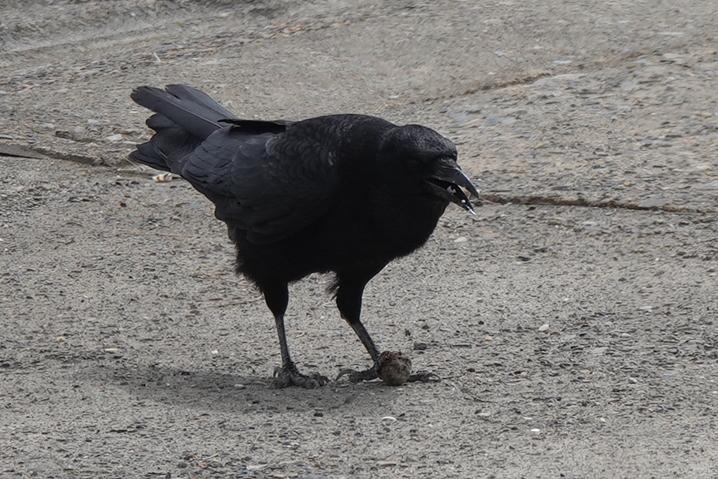 【写真7】クルミの殻の間にくちばしを入れて中身を食べようとしているハシボソガラス(3/27)