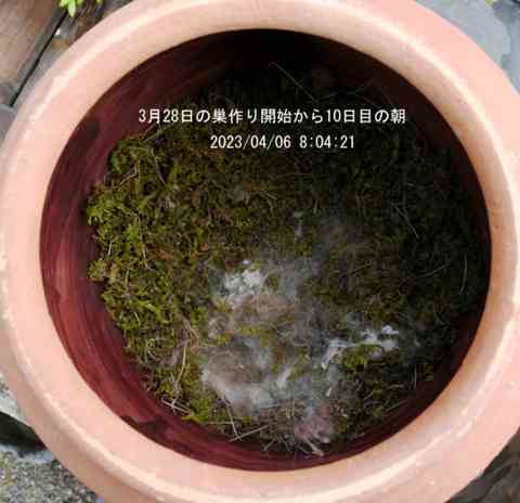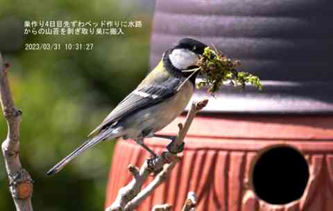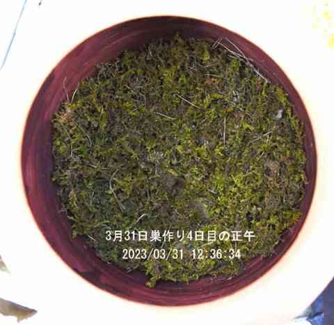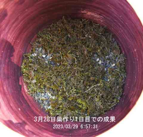 壺の底部に厚さ5センチの小砂利を置く。シジュウガラはペアで付近の水路からベッド作りの巣材、山苔を朝から日没まで搬入。