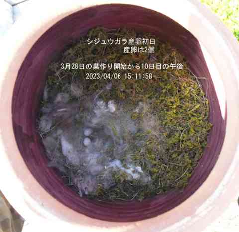 わが家の庭内に設置した壺巣箱にシジュウガラのペアが3月28日より巣作りを開始、今年は初めての試みで【壺】巣箱内で雛が巣立ちするまでの全記録を動画で挑戦します。機材のカメラは超小型のアクションカメラを県内探し回り何とか2台購入。内1台を屋根蓋脱着式の屋根裏に難義するもしっかりと取付。先ずは、アップ映像としてシジュウガラのオスが巣作りに奮闘する貴重な映像をご覧下さい。巣作りの日数は撮影日4月4日までの8日間、この間の撮影記録は数十回なれど殆どが30秒前後以下、あとは1分間が1回と今回の約3分間が一度だけでした。それにしても(人間なら)敷布と掛け布団に当たる羽毛を嘴で丁寧に何回も産室周辺に突き込み凄く感動的なシーンを見せてくれました。※この後、4月6日の早朝に一回目の産卵2個を確認(静止画で)、3個目は4月7日の予定です。※今年の産卵日は昨年より一週間ほど早いです。
