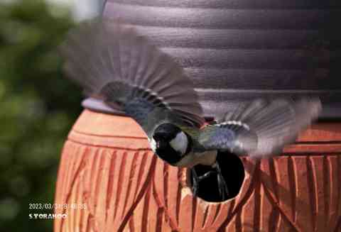 巣箱代わりに陶器の壺を使用してもらいました。(今年3回目で2020年2022年にも使用)