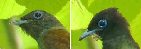 給餌中のサンコウチョウ頭部で、左が雌、右が短尾雄です。