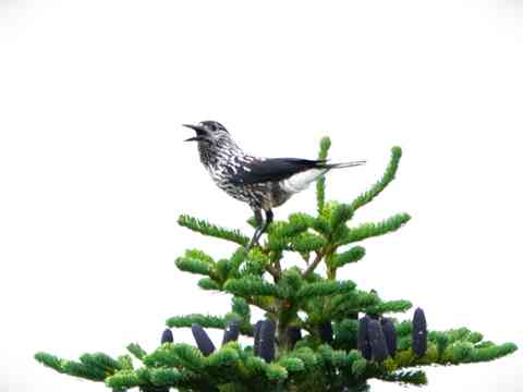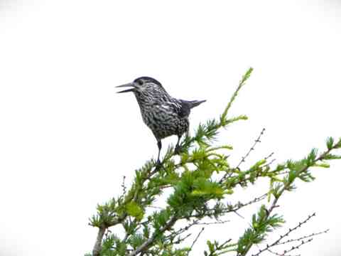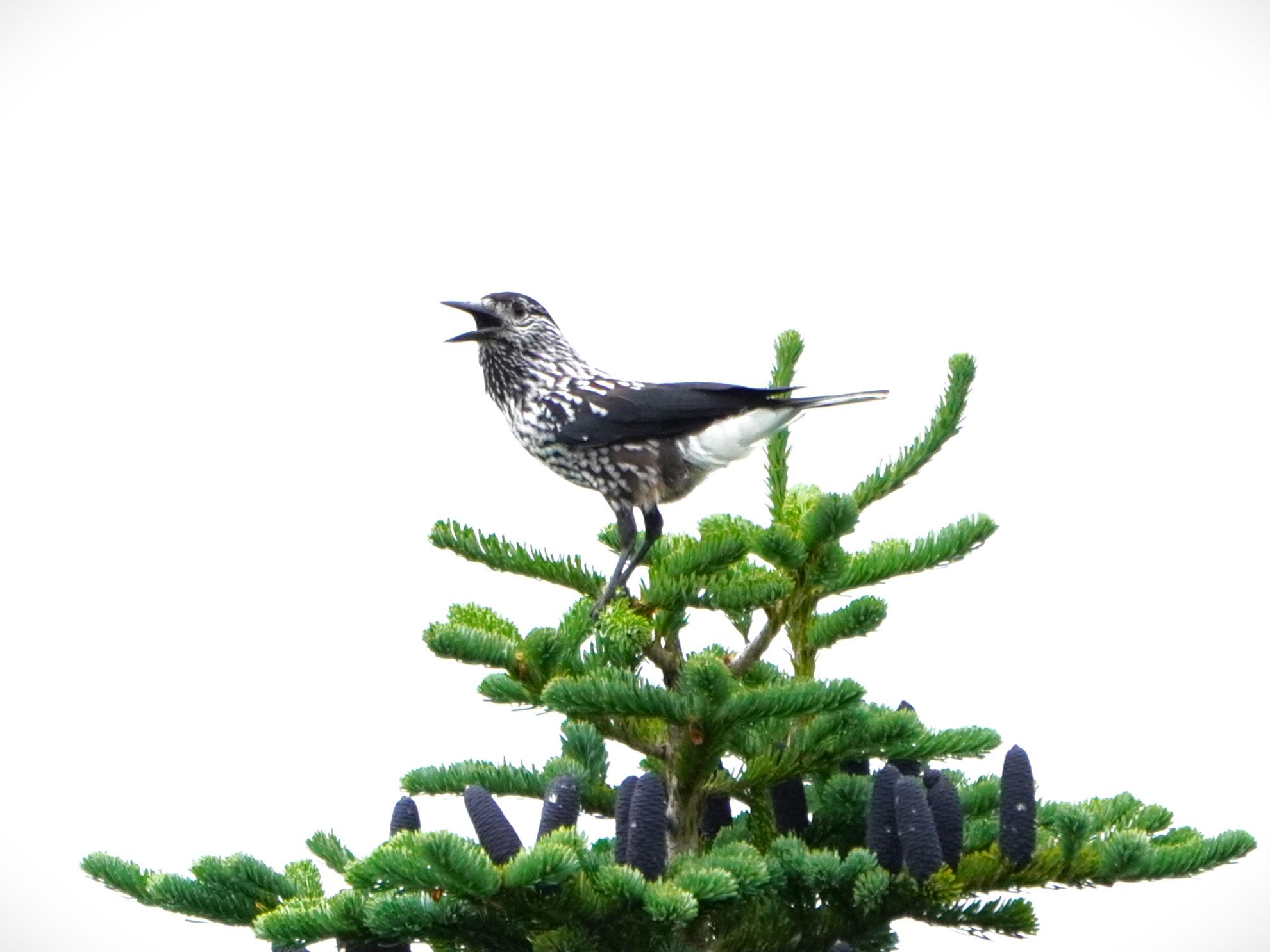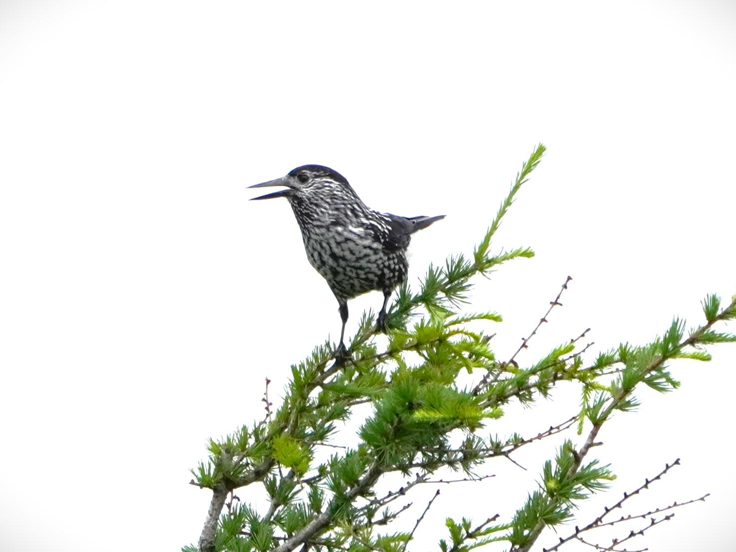 16日の日光白根山探鳥会に行けなかったので、17日リベンジで野鳥の会群馬のお友達4名及び妻と湯ノ丸高原に上ってみました。亜高山帯で鳥種は限られてしまい、ビンズイ・ルリビタキ・メボソムシクイ・ウソ・アカハラ・コガラ・ヒガラ等で17種、それも樹間が多く姿が確認しくかったです。それでも天気予報が外れて曇りがちながら時々晴れるという天候で、高山植物や天然記念物のミヤマモンキチョウを観察できました。昼食中急に現れたホシガラスには皆さん慌てましたが全員がじっくりと堪能できました。止まっている木の松ぼっくりの実はシラビソでしょうか?オオシラビソ(アオモリトドマツ)でしょうか?