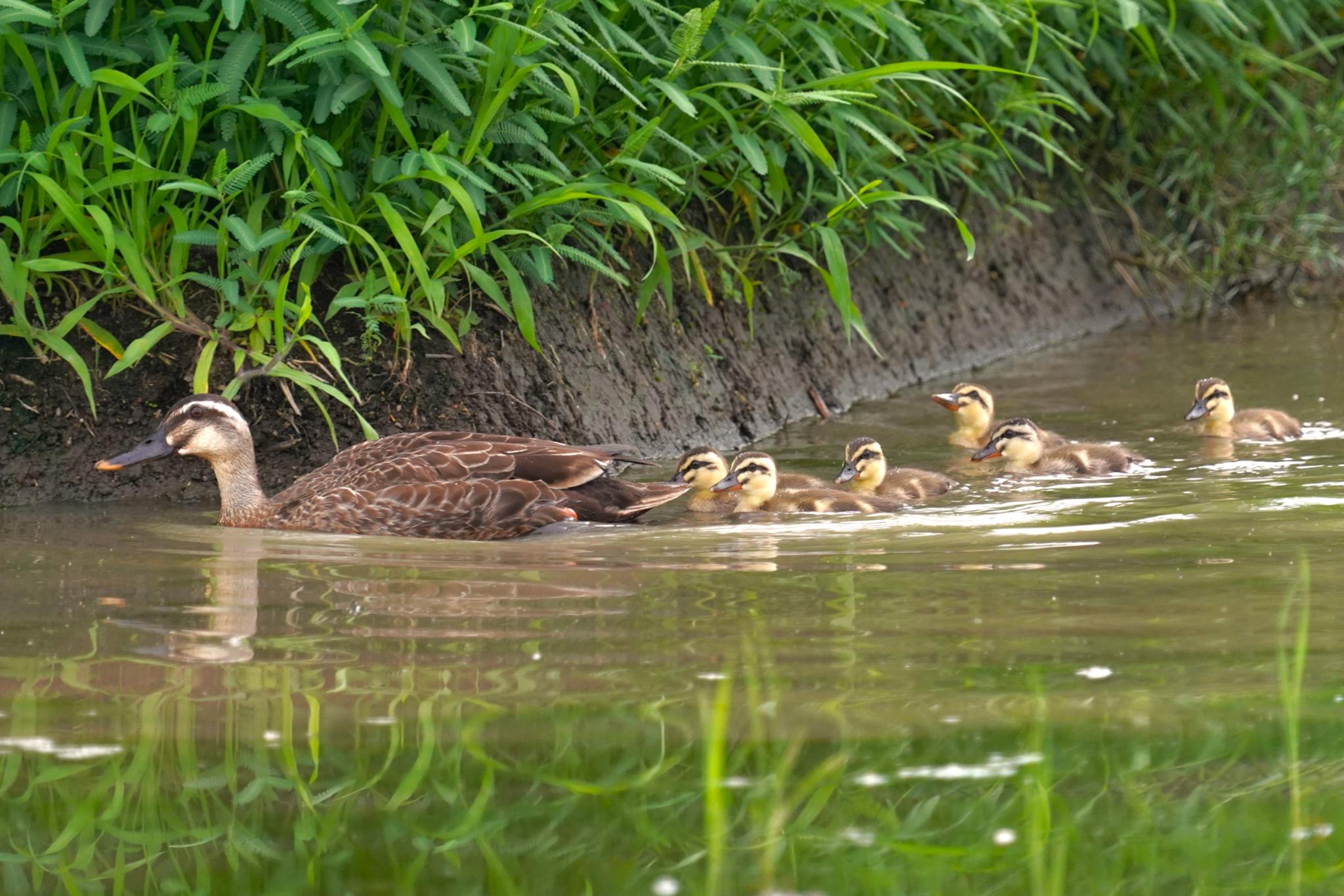 白いカラスを撮影しに出かけましたが残念ながら会えなくて、帰ろうと思ったら目の前の田んぼ(休耕田)をカルガモの親子が泳いで来ました。子供の数は6羽、ラッキーな気分でした。