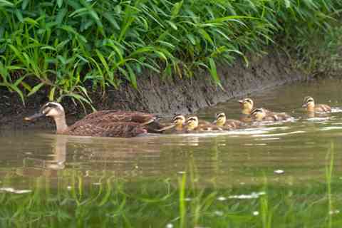 白いカラスを撮影しに出かけましたが残念ながら会えなくて、帰ろうと思ったら目の前の田んぼ(休耕田)をカルガモの親子が泳いで来ました。子供の数は6羽、ラッキーな気分でした。