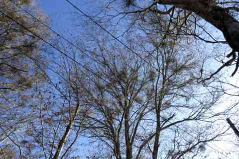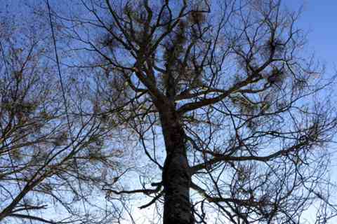窓から、樹立する葉が落ちた三本の木に沢山見られ、渡りの時期に