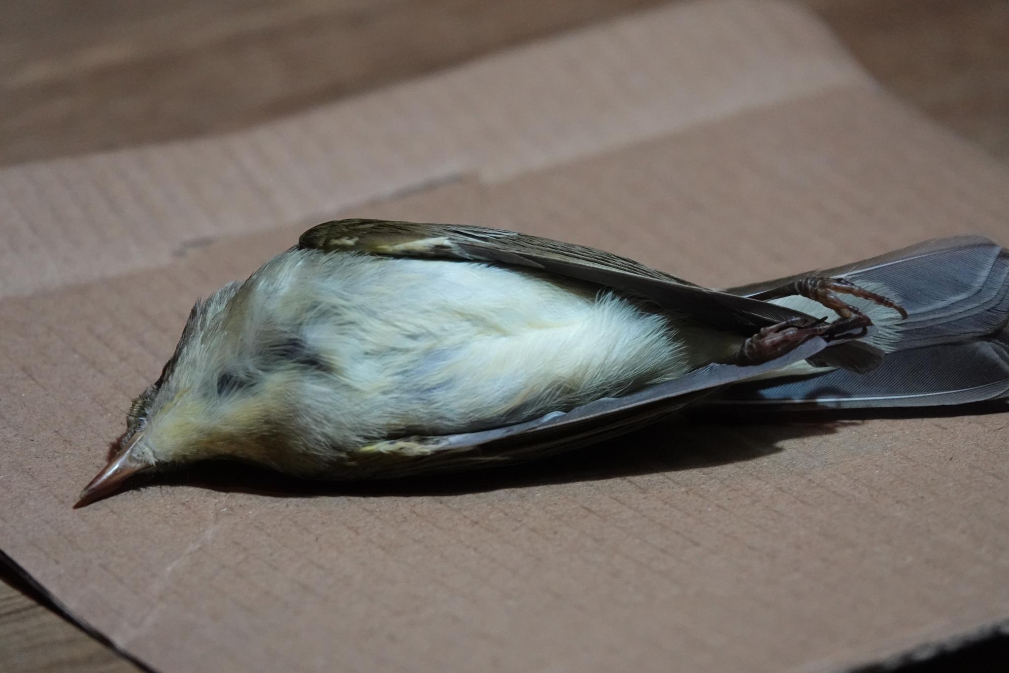 10月31日15:50 孫を幼稚園に迎えに行ったら、窓の下にムシクイの仲間かと思われる鳥が息絶えていました。多分、窓に激突したのではないかと思われます。